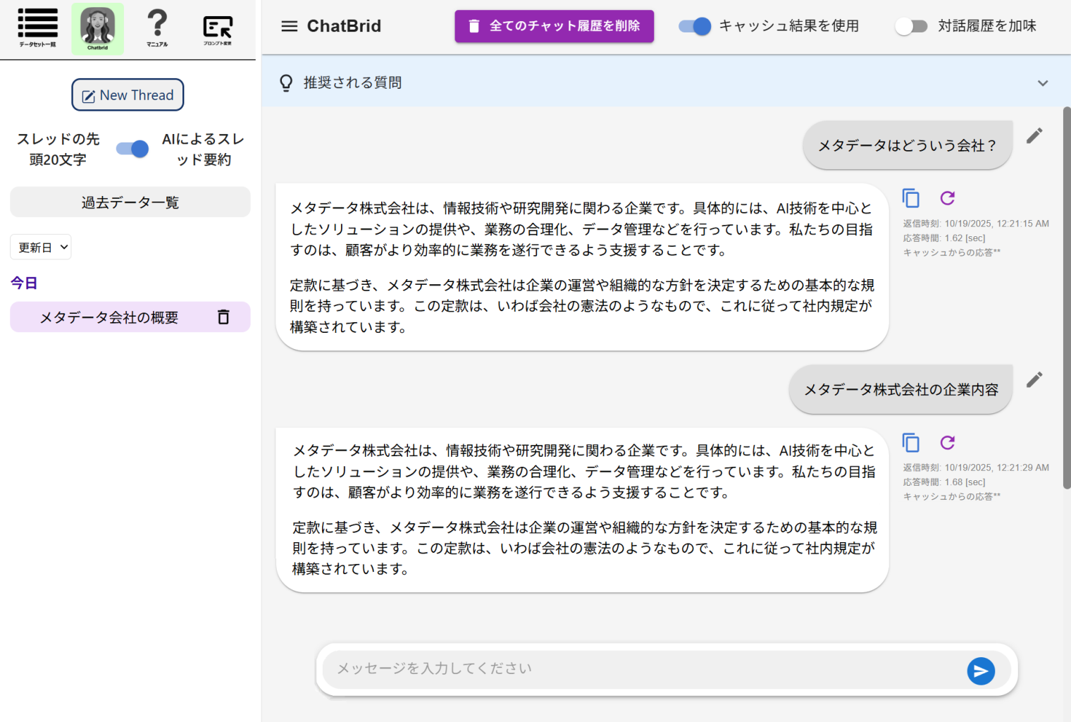 ・平均応答時間の短縮:キャッシュヒット時は即時返答。実測では、質問「メタデータはどういう会社?」に対し1.62秒で6行の回答を表示。続けて「メタデータ株式会社の企業内容」と入力したケースでも、ローカル実行の軽量LLMにより1.68秒で前回と一字一句同じ回答を返しました。