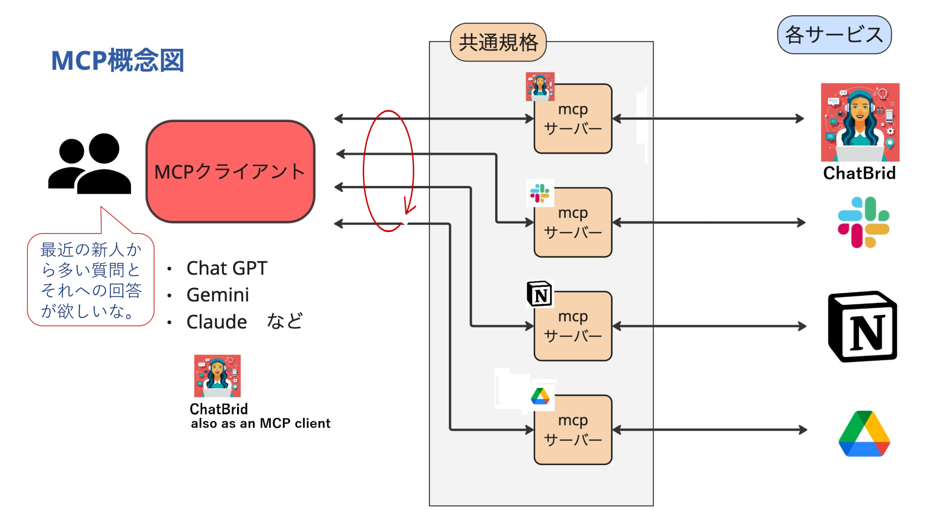 柔軟な切換え:同じプロンプトから、ChatBrid・Slack・Notion・Driveなど複数のMCPサーバーを横断し、タスクに応じて切り替え可能。